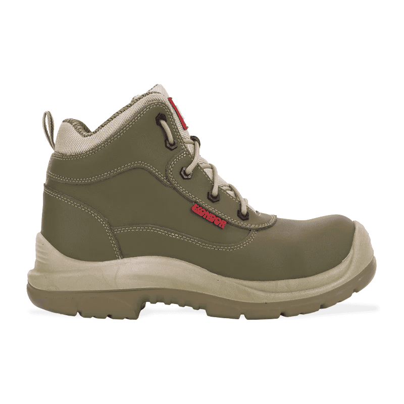 Botas Kondor con capelladas en micropiel, puntera en policarbonato y suela en poliuretano, tridensidad confortable y liviano.