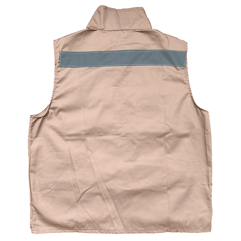 Chaleco en drill con cuello, cremallera frontal, cinta reflectiva gris de 5cm en frente y espalda. Además, cuenta con 8 bolsillos delanteros de cierre y velcro.