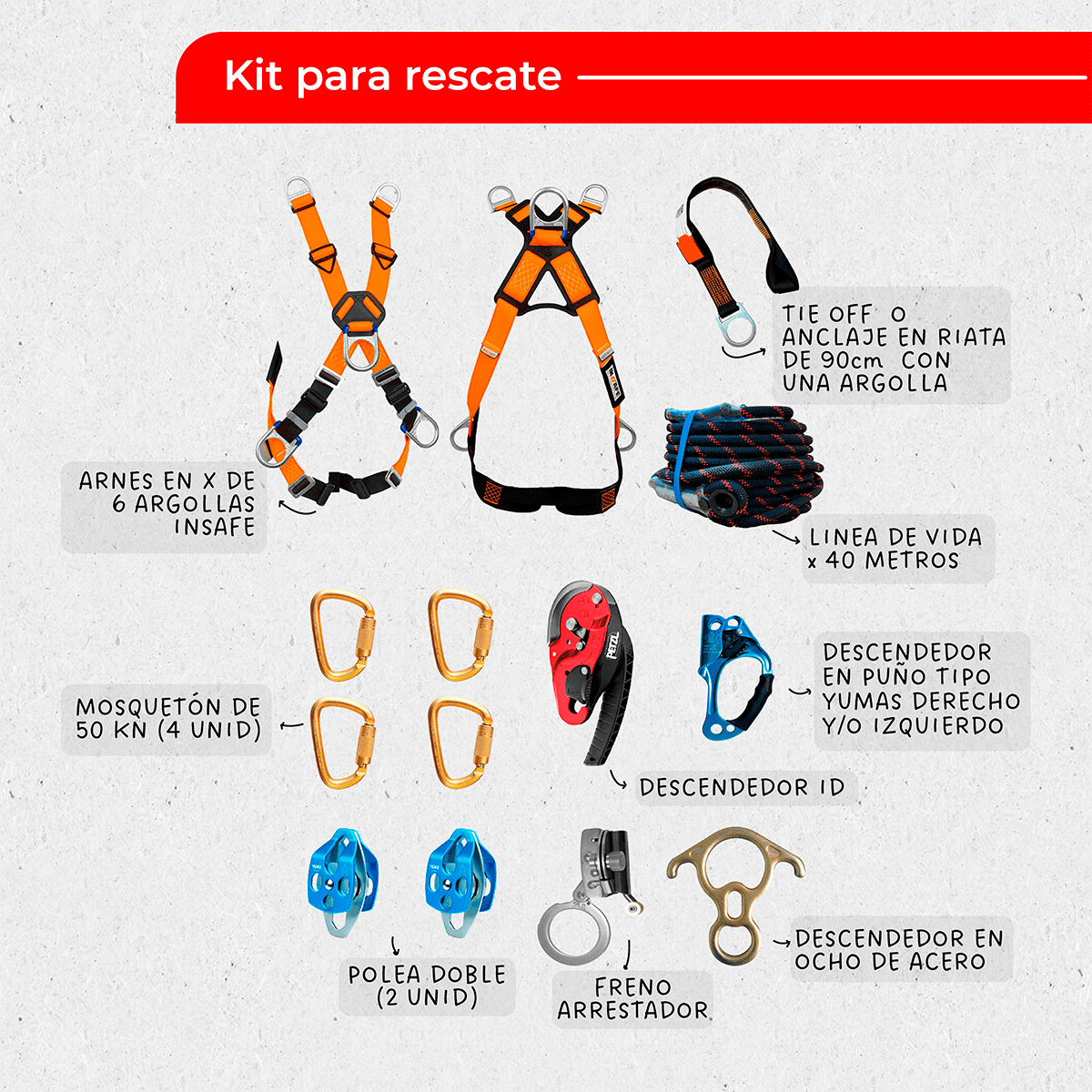 El kit para rescate en alturas es un componente del sistema personal de detención de caídas, diseñado para ser utilizado en trabajos en alturas. Permite el descenso y rescate de manera controlada, además, ofrece seguridad durante la intervención. Este kit incluye elementos como cuerdas, dispositivos de ascenso y descenso, bloqueadores, poleas, arneses y otros accesorios necesarios para realizar un rescate eficaz y seguro.